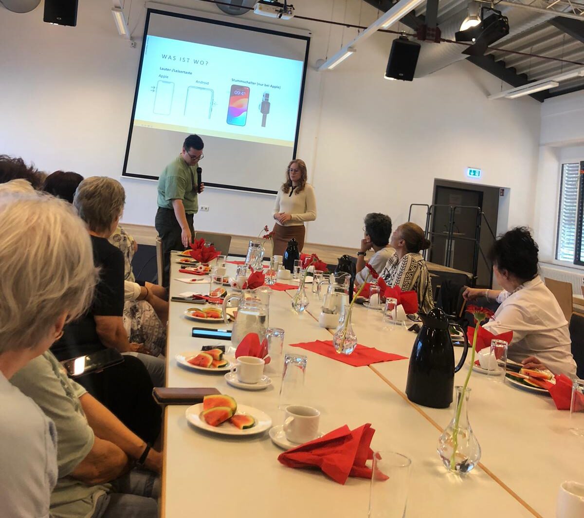 Für die vierte Veranstaltung der Reihe ‚meine Auszeit‘ kam Omnes e. V. vorbei, um den Teilnehmerinnen und Teilnehmern einen Überblick über ihr Smartphone zu geben. Es gab zunächst einen Vortrag zu den ersten Schritten und Einstellungen der Handys und im Anschluss wurde in kleinen Gruppen über individuelle Fragen rund um das Thema Smartphonenutzung gesprochen. Zum Abschluss ging es um Risiken. Enkeltrick, Viren, Spammails und Fake-Nachrichten sowie -anrufe machten den Teilnehmerinnen Sorgen und sie bekamen einen gute Plan an die Hand, wie sie solche erkennen können und gut damit umgehen.